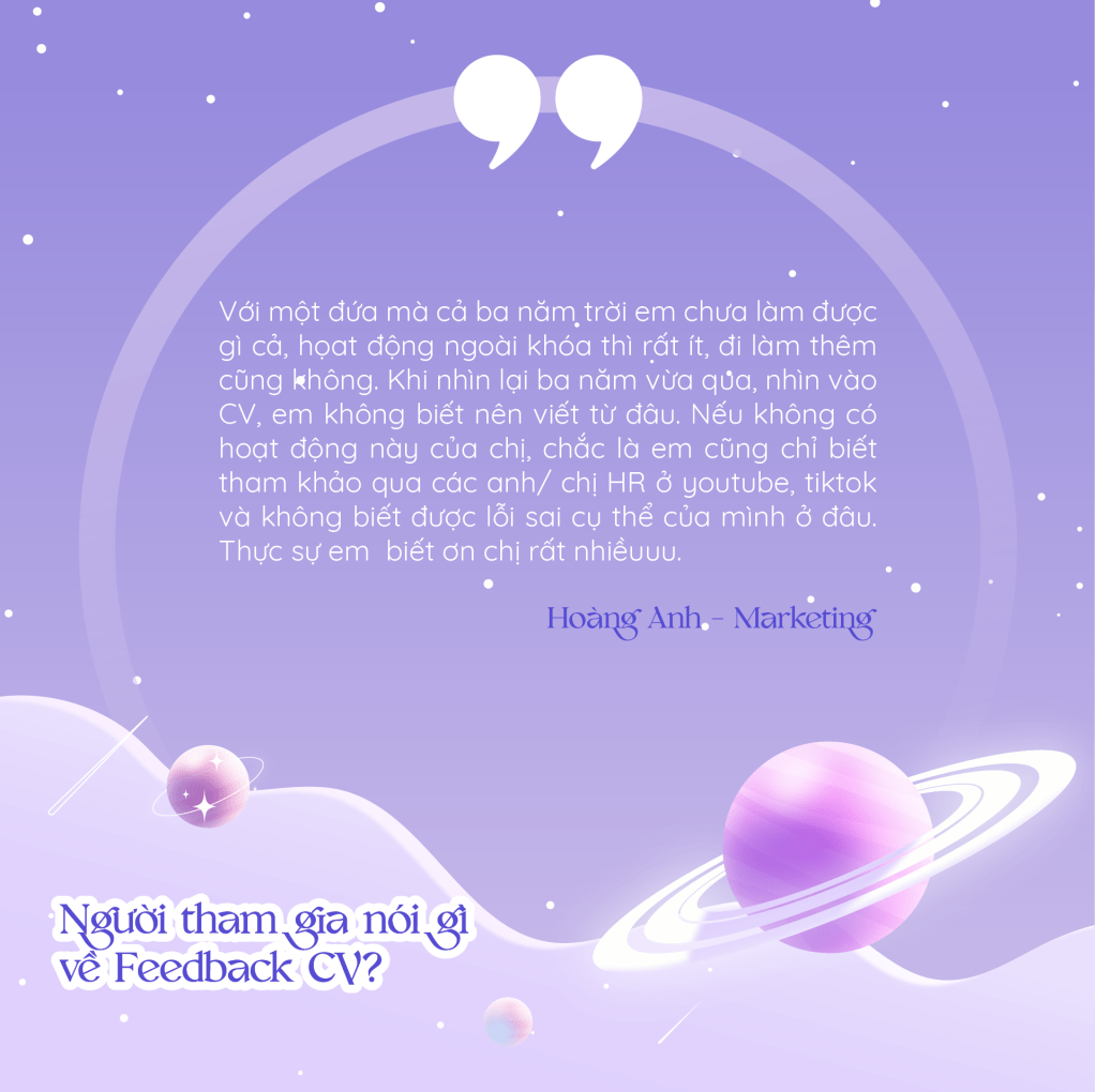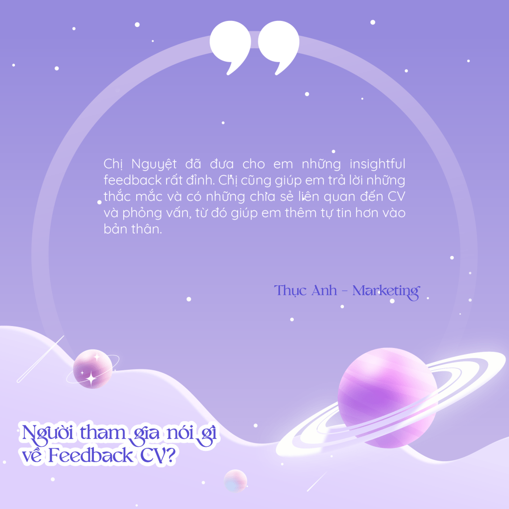 Như chia sẻ ở trên, Nguyệt đã có những hoạt động feedback CV cho các bạn sinh viên (bao gồm meeting, text feedback miễn phí và session có donate), dưới đây là một vài chia sẻ từ các bạn sau khi session kết thúc: