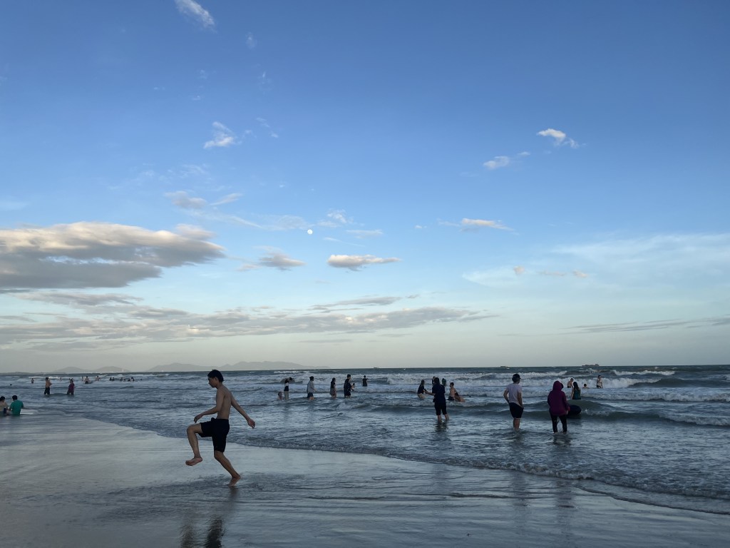 Lúc đó, mình thấy có một cậu nhóc, chừng 3, 4 tuổi tóc xoăn trông vô cùng dễ thương đang la hét sung sướng vì “bị đuổi”. Ảnh chạy theo sóng biển, rồi chờ lúc sóng lớn đến gần, ảnh chạy thật nhanh vào bờ và la lên cười khoái chí. Chị gái của cậu nhóc thì đang chụp hình với bạn, lâu lâu hướng mắt qua xem cậu có ổn không. Mỗi khi sóng lên cao hơn so với khả năng “chống đỡ” của cậu, chị gái sẽ la lên: “ê coi chừng kìa”, và chổng mông lên trời là cách xử lý vấn đề của cậu nhóc. Trông vừa dễ thương, vừa buồn cười.