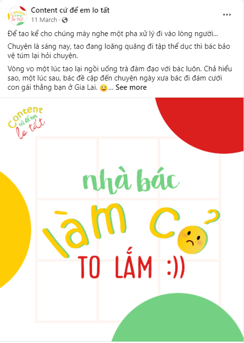 Ban đầu, định hướng của mình là sẽ xây dựng con page để thay đổi phong cách viết. So với blog thì mình viết văn phong nghiêm túc một xíu, mang tính chia sẻ giá trị nhiều một xíu; còn với page này mình dùng để phát triển phong cách hài hước nhưng vẫn lịch sự. Nhưng ẩn sâu sau đó là để kể những câu chuyện trên trời rơi xuống mà mình gặp thui.